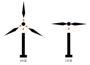 また、台風の時のリスクが低減できることもメリットとして挙げられます。通常、一定の風速になると安全のために風力発電を停止します。その際、2枚翼であれば横で静止させることで、表からくる風、横からくる風を逃すことが可能です。3枚翼の場合は、表からの風を逃すことができますが、横からの風を逃すことができず、事故につながるリスクが高くなります。効率については、2枚翼も3枚翼も変わりませんが、2枚翼の方が風切り音が大きいというデメリットがあります。