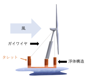 3つ目の特徴は、大規模な風車にも耐える軽量化した浮体です。今回の実証機の大きさは180m×100m弱の大きさで、新国立競技場におさまらないぐらいの巨大な構造物です。例えば、タワーの部分を大幅に軽量化しています。通常のタワーの直径は5-6mですが、今回の実証機は3-4mとなっており、その代わり3方向に2本ずつガイワイヤーを用いて固定しています。先ほども説明したように、軽量化することでコスト削減につなげています。