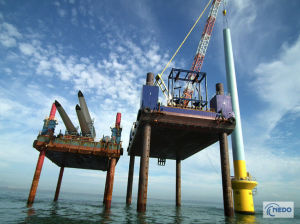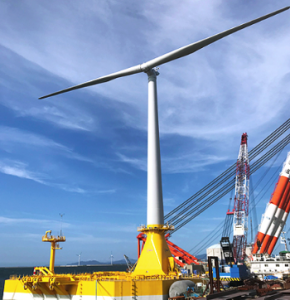 バージ型浮体風車の港湾におけるタワーと風車の組立完了後(出典:NEDO)